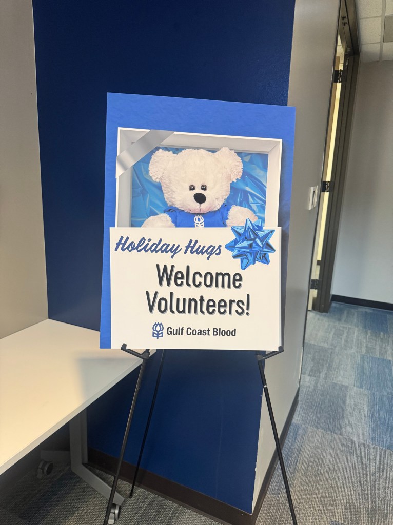 HOUSTON (THE K SPOT NEWS)—Gulf Coast Blood recently hosted its annual ‘Holiday Hugs’ volunteer event to spread much-needed holiday cheer to local hospital patients that depend on blood donations. The event consists of volunteers and donors writing positive notes and attaching it to more than 1,000 teddy bears to be delivered to patients.